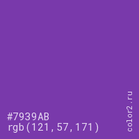 Цвет #7939AB в цветовой модели RGB обозначается тремя октетами (121, 57, 171) в десятичном формате и #7939AB в шестнадцатиричном (hex) формате, которые являются интенсивностью красного 121 (hex 79), интенсивность зелёного 57 (hex 39) и интенсивность синего 171 (hex AB).