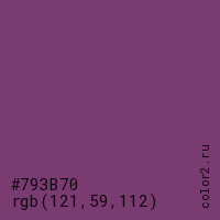 Цвет #793B70 в цветовой модели RGB обозначается тремя октетами (121, 59, 112) в десятичном формате и #793B70 в шестнадцатиричном (hex) формате, которые являются интенсивностью красного 121 (hex 79), интенсивность зелёного 59 (hex 3B) и интенсивность синего 112 (hex 70).