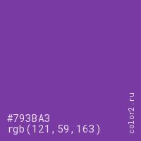 Цвет #793BA3 в цветовой модели RGB обозначается тремя октетами (121, 59, 163) в десятичном формате и #793BA3 в шестнадцатиричном (hex) формате, которые являются интенсивностью красного 121 (hex 79), интенсивность зелёного 59 (hex 3B) и интенсивность синего 163 (hex A3).