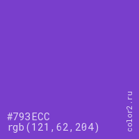 Цвет #793ECC в цветовой модели RGB обозначается тремя октетами (121, 62, 204) в десятичном формате и #793ECC в шестнадцатиричном (hex) формате, которые являются интенсивностью красного 121 (hex 79), интенсивность зелёного 62 (hex 3E) и интенсивность синего 204 (hex CC).