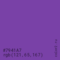 Цвет #7941A7 в цветовой модели RGB обозначается тремя октетами (121, 65, 167) в десятичном формате и #7941A7 в шестнадцатиричном (hex) формате, которые являются интенсивностью красного 121 (hex 79), интенсивность зелёного 65 (hex 41) и интенсивность синего 167 (hex A7).