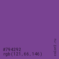 Цвет #794292 в цветовой модели RGB обозначается тремя октетами (121, 66, 146) в десятичном формате и #794292 в шестнадцатиричном (hex) формате, которые являются интенсивностью красного 121 (hex 79), интенсивность зелёного 66 (hex 42) и интенсивность синего 146 (hex 92).