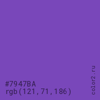 Цвет #7947BA в цветовой модели RGB обозначается тремя октетами (121, 71, 186) в десятичном формате и #7947BA в шестнадцатиричном (hex) формате, которые являются интенсивностью красного 121 (hex 79), интенсивность зелёного 71 (hex 47) и интенсивность синего 186 (hex BA).