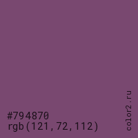 Цвет #794870 в цветовой модели RGB обозначается тремя октетами (121, 72, 112) в десятичном формате и #794870 в шестнадцатиричном (hex) формате, которые являются интенсивностью красного 121 (hex 79), интенсивность зелёного 72 (hex 48) и интенсивность синего 112 (hex 70).