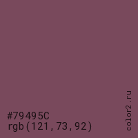 Цвет #79495C в цветовой модели RGB обозначается тремя октетами (121, 73, 92) в десятичном формате и #79495C в шестнадцатиричном (hex) формате, которые являются интенсивностью красного 121 (hex 79), интенсивность зелёного 73 (hex 49) и интенсивность синего 92 (hex 5C).