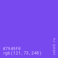 Цвет #7949F0 в цветовой модели RGB обозначается тремя октетами (121, 73, 240) в десятичном формате и #7949F0 в шестнадцатиричном (hex) формате, которые являются интенсивностью красного 121 (hex 79), интенсивность зелёного 73 (hex 49) и интенсивность синего 240 (hex F0).