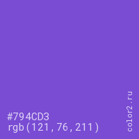 Цвет #794CD3 в цветовой модели RGB обозначается тремя октетами (121, 76, 211) в десятичном формате и #794CD3 в шестнадцатиричном (hex) формате, которые являются интенсивностью красного 121 (hex 79), интенсивность зелёного 76 (hex 4C) и интенсивность синего 211 (hex D3).