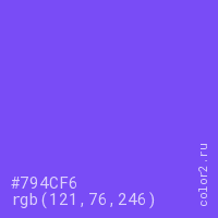 Цвет #794CF6 в цветовой модели RGB обозначается тремя октетами (121, 76, 246) в десятичном формате и #794CF6 в шестнадцатиричном (hex) формате, которые являются интенсивностью красного 121 (hex 79), интенсивность зелёного 76 (hex 4C) и интенсивность синего 246 (hex F6).