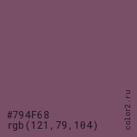 Цвет #794F68 в цветовой модели RGB обозначается тремя октетами (121, 79, 104) в десятичном формате и #794F68 в шестнадцатиричном (hex) формате, которые являются интенсивностью красного 121 (hex 79), интенсивность зелёного 79 (hex 4F) и интенсивность синего 104 (hex 68).