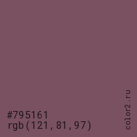Цвет #795161 в цветовой модели RGB обозначается тремя октетами (121, 81, 97) в десятичном формате и #795161 в шестнадцатиричном (hex) формате, которые являются интенсивностью красного 121 (hex 79), интенсивность зелёного 81 (hex 51) и интенсивность синего 97 (hex 61).