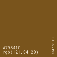 Цвет #79541C в цветовой модели RGB обозначается тремя октетами (121, 84, 28) в десятичном формате и #79541C в шестнадцатиричном (hex) формате, которые являются интенсивностью красного 121 (hex 79), интенсивность зелёного 84 (hex 54) и интенсивность синего 28 (hex 1C).