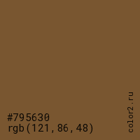 Цвет #795630 в цветовой модели RGB обозначается тремя октетами (121, 86, 48) в десятичном формате и #795630 в шестнадцатиричном (hex) формате, которые являются интенсивностью красного 121 (hex 79), интенсивность зелёного 86 (hex 56) и интенсивность синего 48 (hex 30).