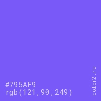 Цвет #795AF9 в цветовой модели RGB обозначается тремя октетами (121, 90, 249) в десятичном формате и #795AF9 в шестнадцатиричном (hex) формате, которые являются интенсивностью красного 121 (hex 79), интенсивность зелёного 90 (hex 5A) и интенсивность синего 249 (hex F9).
