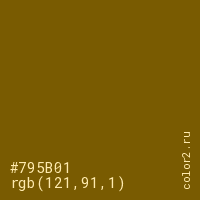 Цвет #795B01 в цветовой модели RGB обозначается тремя октетами (121, 91, 1) в десятичном формате и #795B01 в шестнадцатиричном (hex) формате, которые являются интенсивностью красного 121 (hex 79), интенсивность зелёного 91 (hex 5B) и интенсивность синего 1 (hex 01).