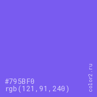 Цвет #795BF0 в цветовой модели RGB обозначается тремя октетами (121, 91, 240) в десятичном формате и #795BF0 в шестнадцатиричном (hex) формате, которые являются интенсивностью красного 121 (hex 79), интенсивность зелёного 91 (hex 5B) и интенсивность синего 240 (hex F0).