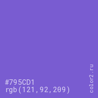 Цвет #795CD1 в цветовой модели RGB обозначается тремя октетами (121, 92, 209) в десятичном формате и #795CD1 в шестнадцатиричном (hex) формате, которые являются интенсивностью красного 121 (hex 79), интенсивность зелёного 92 (hex 5C) и интенсивность синего 209 (hex D1).