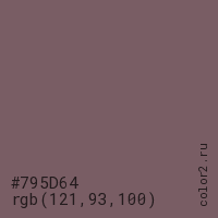 Цвет #795D64 в цветовой модели RGB обозначается тремя октетами (121, 93, 100) в десятичном формате и #795D64 в шестнадцатиричном (hex) формате, которые являются интенсивностью красного 121 (hex 79), интенсивность зелёного 93 (hex 5D) и интенсивность синего 100 (hex 64).