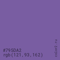 Цвет #795DA2 в цветовой модели RGB обозначается тремя октетами (121, 93, 162) в десятичном формате и #795DA2 в шестнадцатиричном (hex) формате, которые являются интенсивностью красного 121 (hex 79), интенсивность зелёного 93 (hex 5D) и интенсивность синего 162 (hex A2).