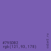 Цвет #795DB2 в цветовой модели RGB обозначается тремя октетами (121, 93, 178) в десятичном формате и #795DB2 в шестнадцатиричном (hex) формате, которые являются интенсивностью красного 121 (hex 79), интенсивность зелёного 93 (hex 5D) и интенсивность синего 178 (hex B2).