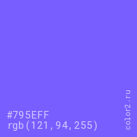 Цвет #795EFF в цветовой модели RGB обозначается тремя октетами (121, 94, 255) в десятичном формате и #795EFF в шестнадцатиричном (hex) формате, которые являются интенсивностью красного 121 (hex 79), интенсивность зелёного 94 (hex 5E) и интенсивность синего 255 (hex FF).