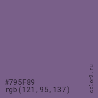 Цвет #795F89 в цветовой модели RGB обозначается тремя октетами (121, 95, 137) в десятичном формате и #795F89 в шестнадцатиричном (hex) формате, которые являются интенсивностью красного 121 (hex 79), интенсивность зелёного 95 (hex 5F) и интенсивность синего 137 (hex 89).