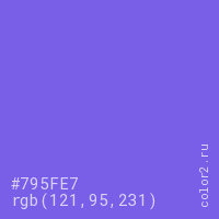 Цвет #795FE7 в цветовой модели RGB обозначается тремя октетами (121, 95, 231) в десятичном формате и #795FE7 в шестнадцатиричном (hex) формате, которые являются интенсивностью красного 121 (hex 79), интенсивность зелёного 95 (hex 5F) и интенсивность синего 231 (hex E7).