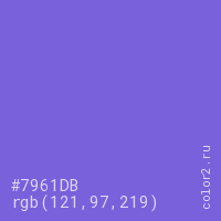 Цвет #7961DB в цветовой модели RGB обозначается тремя октетами (121, 97, 219) в десятичном формате и #7961DB в шестнадцатиричном (hex) формате, которые являются интенсивностью красного 121 (hex 79), интенсивность зелёного 97 (hex 61) и интенсивность синего 219 (hex DB).