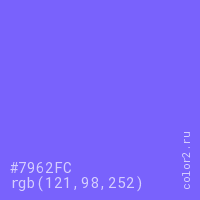 Цвет #7962FC в цветовой модели RGB обозначается тремя октетами (121, 98, 252) в десятичном формате и #7962FC в шестнадцатиричном (hex) формате, которые являются интенсивностью красного 121 (hex 79), интенсивность зелёного 98 (hex 62) и интенсивность синего 252 (hex FC).