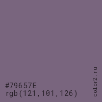 Цвет #79657E в цветовой модели RGB обозначается тремя октетами (121, 101, 126) в десятичном формате и #79657E в шестнадцатиричном (hex) формате, которые являются интенсивностью красного 121 (hex 79), интенсивность зелёного 101 (hex 65) и интенсивность синего 126 (hex 7E).