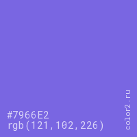 Цвет #7966E2 в цветовой модели RGB обозначается тремя октетами (121, 102, 226) в десятичном формате и #7966E2 в шестнадцатиричном (hex) формате, которые являются интенсивностью красного 121 (hex 79), интенсивность зелёного 102 (hex 66) и интенсивность синего 226 (hex E2).