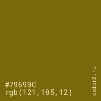Цвет #79690C в цветовой модели RGB обозначается тремя октетами (121, 105, 12) в десятичном формате и #79690C в шестнадцатиричном (hex) формате, которые являются интенсивностью красного 121 (hex 79), интенсивность зелёного 105 (hex 69) и интенсивность синего 12 (hex 0C).