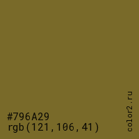Цвет #796A29 в цветовой модели RGB обозначается тремя октетами (121, 106, 41) в десятичном формате и #796A29 в шестнадцатиричном (hex) формате, которые являются интенсивностью красного 121 (hex 79), интенсивность зелёного 106 (hex 6A) и интенсивность синего 41 (hex 29).