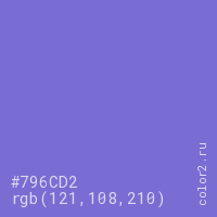 Цвет #796CD2 в цветовой модели RGB обозначается тремя октетами (121, 108, 210) в десятичном формате и #796CD2 в шестнадцатиричном (hex) формате, которые являются интенсивностью красного 121 (hex 79), интенсивность зелёного 108 (hex 6C) и интенсивность синего 210 (hex D2).