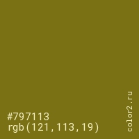 Цвет #797113 в цветовой модели RGB обозначается тремя октетами (121, 113, 19) в десятичном формате и #797113 в шестнадцатиричном (hex) формате, которые являются интенсивностью красного 121 (hex 79), интенсивность зелёного 113 (hex 71) и интенсивность синего 19 (hex 13).