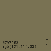 Цвет #797253 в цветовой модели RGB обозначается тремя октетами (121, 114, 83) в десятичном формате и #797253 в шестнадцатиричном (hex) формате, которые являются интенсивностью красного 121 (hex 79), интенсивность зелёного 114 (hex 72) и интенсивность синего 83 (hex 53).
