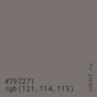 Цвет #797271 в цветовой модели RGB обозначается тремя октетами (121, 114, 113) в десятичном формате и #797271 в шестнадцатиричном (hex) формате, которые являются интенсивностью красного 121 (hex 79), интенсивность зелёного 114 (hex 72) и интенсивность синего 113 (hex 71).