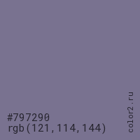 Цвет #797290 в цветовой модели RGB обозначается тремя октетами (121, 114, 144) в десятичном формате и #797290 в шестнадцатиричном (hex) формате, которые являются интенсивностью красного 121 (hex 79), интенсивность зелёного 114 (hex 72) и интенсивность синего 144 (hex 90).