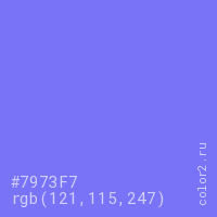 Цвет #7973F7 в цветовой модели RGB обозначается тремя октетами (121, 115, 247) в десятичном формате и #7973F7 в шестнадцатиричном (hex) формате, которые являются интенсивностью красного 121 (hex 79), интенсивность зелёного 115 (hex 73) и интенсивность синего 247 (hex F7).