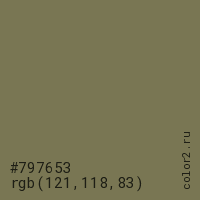 Цвет #797653 в цветовой модели RGB обозначается тремя октетами (121, 118, 83) в десятичном формате и #797653 в шестнадцатиричном (hex) формате, которые являются интенсивностью красного 121 (hex 79), интенсивность зелёного 118 (hex 76) и интенсивность синего 83 (hex 53).