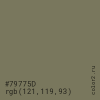 Цвет #79775D в цветовой модели RGB обозначается тремя октетами (121, 119, 93) в десятичном формате и #79775D в шестнадцатиричном (hex) формате, которые являются интенсивностью красного 121 (hex 79), интенсивность зелёного 119 (hex 77) и интенсивность синего 93 (hex 5D).
