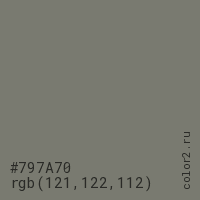 Цвет #797A70 в цветовой модели RGB обозначается тремя октетами (121, 122, 112) в десятичном формате и #797A70 в шестнадцатиричном (hex) формате, которые являются интенсивностью красного 121 (hex 79), интенсивность зелёного 122 (hex 7A) и интенсивность синего 112 (hex 70).