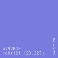 Цвет #797BDF в цветовой модели RGB обозначается тремя октетами (121, 123, 223) в десятичном формате и #797BDF в шестнадцатиричном (hex) формате, которые являются интенсивностью красного 121 (hex 79), интенсивность зелёного 123 (hex 7B) и интенсивность синего 223 (hex DF).