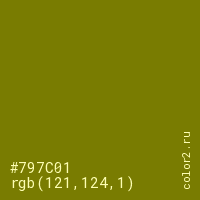 Цвет #797C01 в цветовой модели RGB обозначается тремя октетами (121, 124, 1) в десятичном формате и #797C01 в шестнадцатиричном (hex) формате, которые являются интенсивностью красного 121 (hex 79), интенсивность зелёного 124 (hex 7C) и интенсивность синего 1 (hex 01).