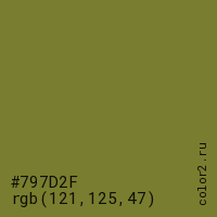 Цвет #797D2F в цветовой модели RGB обозначается тремя октетами (121, 125, 47) в десятичном формате и #797D2F в шестнадцатиричном (hex) формате, которые являются интенсивностью красного 121 (hex 79), интенсивность зелёного 125 (hex 7D) и интенсивность синего 47 (hex 2F).