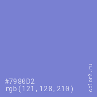 Цвет #7980D2 в цветовой модели RGB обозначается тремя октетами (121, 128, 210) в десятичном формате и #7980D2 в шестнадцатиричном (hex) формате, которые являются интенсивностью красного 121 (hex 79), интенсивность зелёного 128 (hex 80) и интенсивность синего 210 (hex D2).