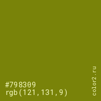 Цвет #798309 в цветовой модели RGB обозначается тремя октетами (121, 131, 9) в десятичном формате и #798309 в шестнадцатиричном (hex) формате, которые являются интенсивностью красного 121 (hex 79), интенсивность зелёного 131 (hex 83) и интенсивность синего 9 (hex 09).
