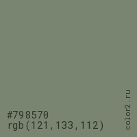 Цвет #798570 в цветовой модели RGB обозначается тремя октетами (121, 133, 112) в десятичном формате и #798570 в шестнадцатиричном (hex) формате, которые являются интенсивностью красного 121 (hex 79), интенсивность зелёного 133 (hex 85) и интенсивность синего 112 (hex 70).