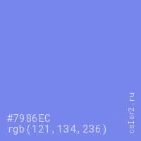 Цвет #7986EC в цветовой модели RGB обозначается тремя октетами (121, 134, 236) в десятичном формате и #7986EC в шестнадцатиричном (hex) формате, которые являются интенсивностью красного 121 (hex 79), интенсивность зелёного 134 (hex 86) и интенсивность синего 236 (hex EC).