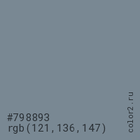 Цвет #798893 в цветовой модели RGB обозначается тремя октетами (121, 136, 147) в десятичном формате и #798893 в шестнадцатиричном (hex) формате, которые являются интенсивностью красного 121 (hex 79), интенсивность зелёного 136 (hex 88) и интенсивность синего 147 (hex 93).