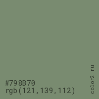Цвет #798B70 в цветовой модели RGB обозначается тремя октетами (121, 139, 112) в десятичном формате и #798B70 в шестнадцатиричном (hex) формате, которые являются интенсивностью красного 121 (hex 79), интенсивность зелёного 139 (hex 8B) и интенсивность синего 112 (hex 70).